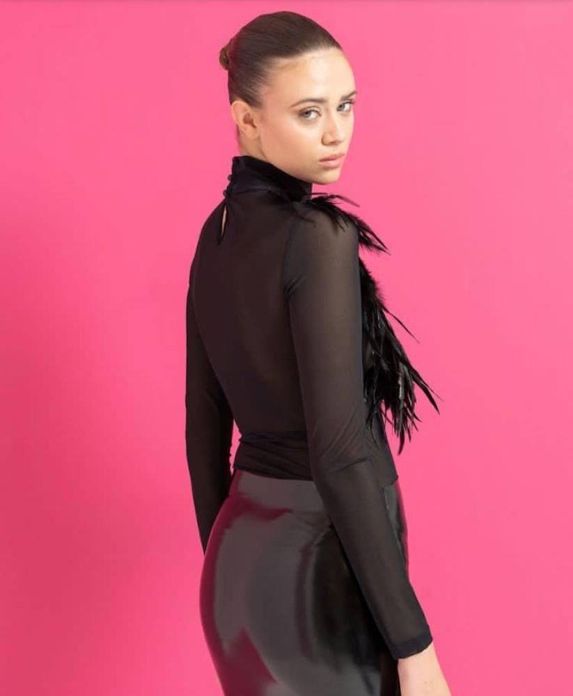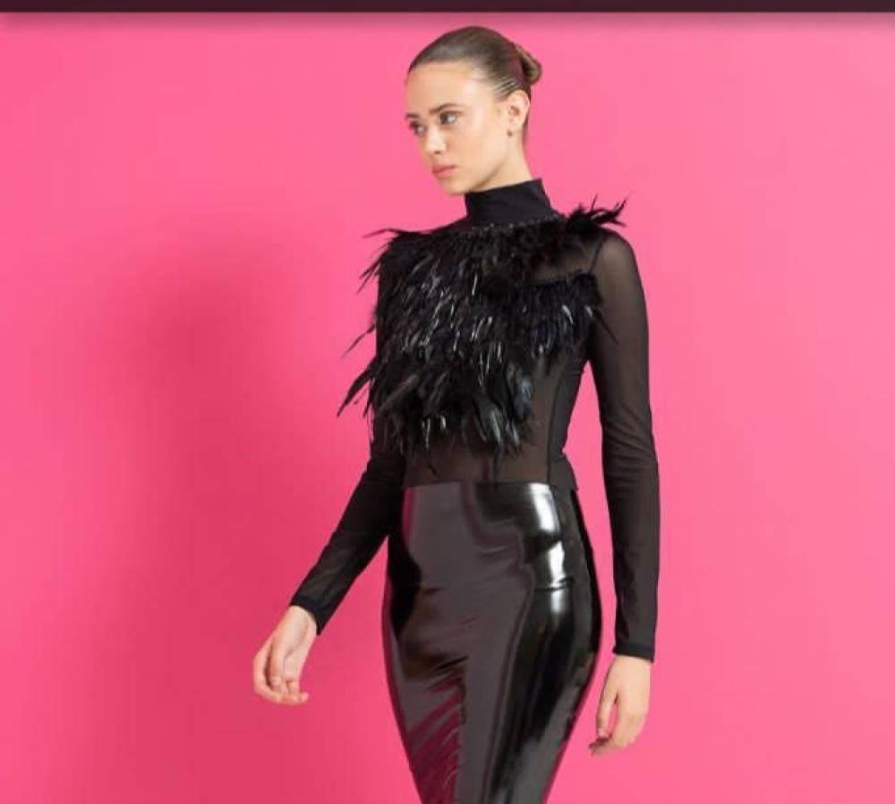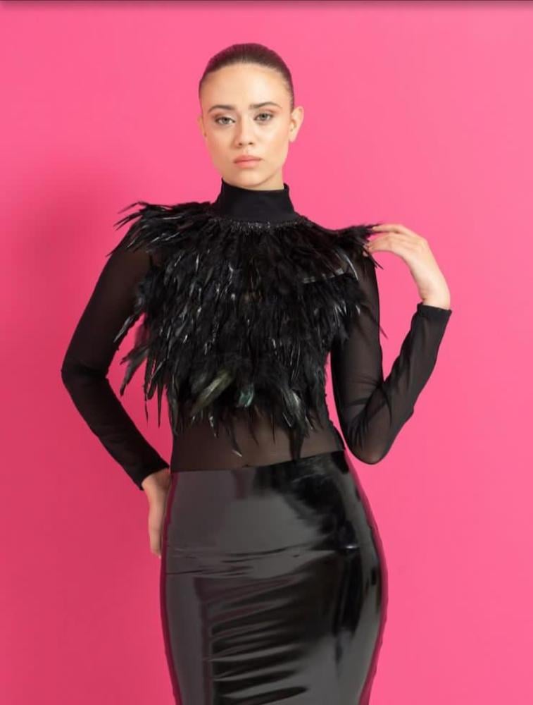 ارتقي بإطلالتك إلى مستوى آخر من الجمال مع هذه البلوزة الجذابة المزينة بالريش الفاخر.
