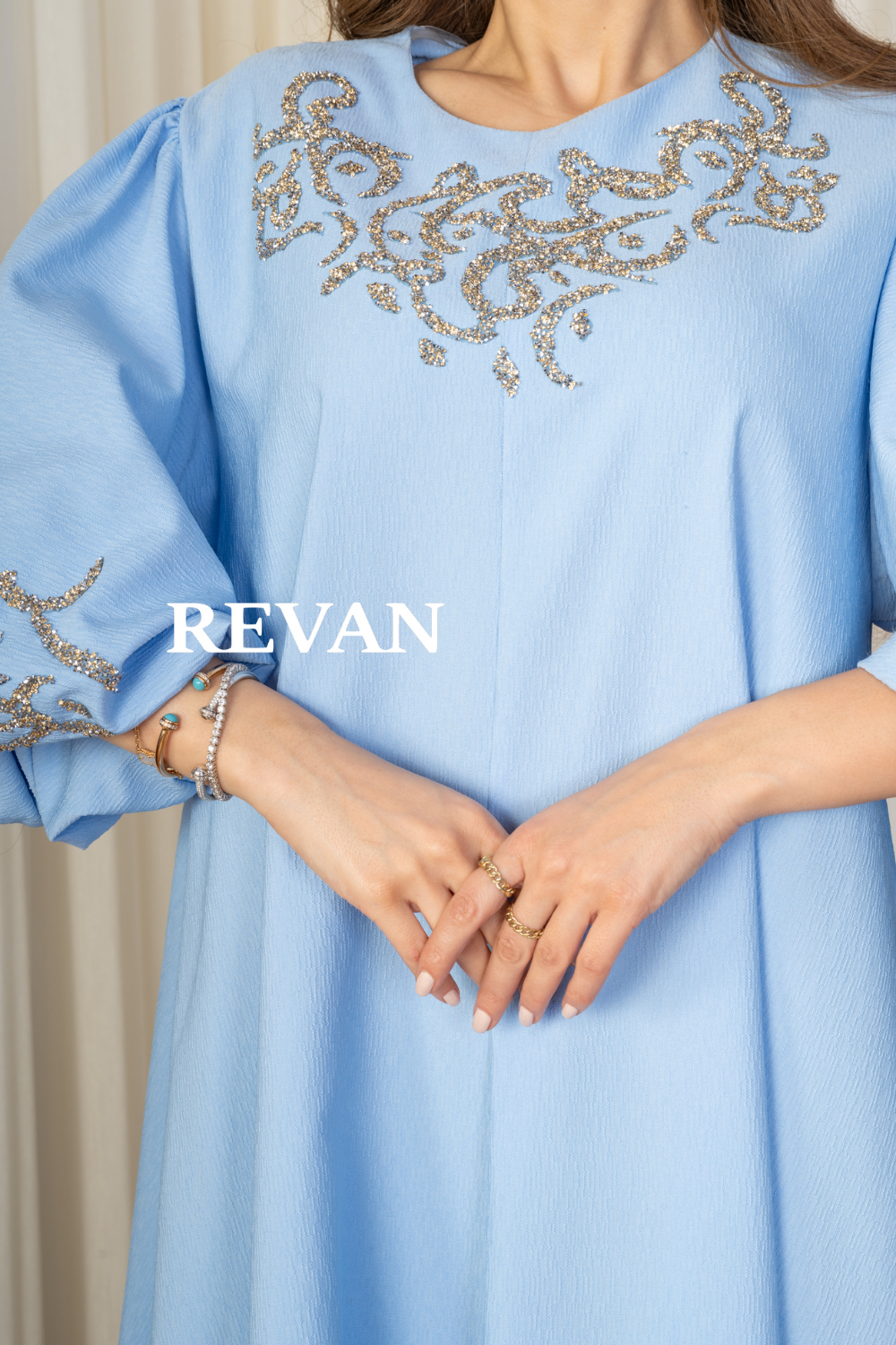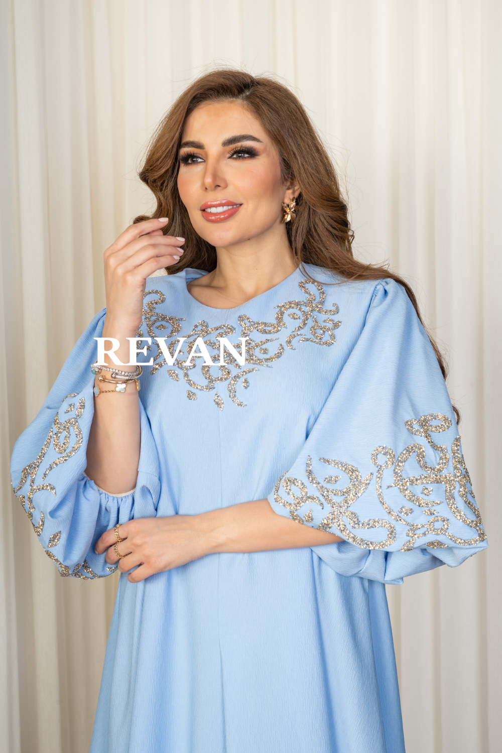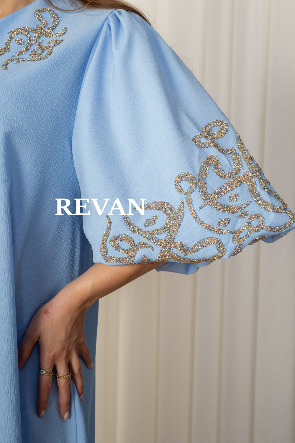 الأكمام: فضفاضة مع تطريز فاخر يضفي لمسة فخامة