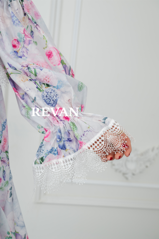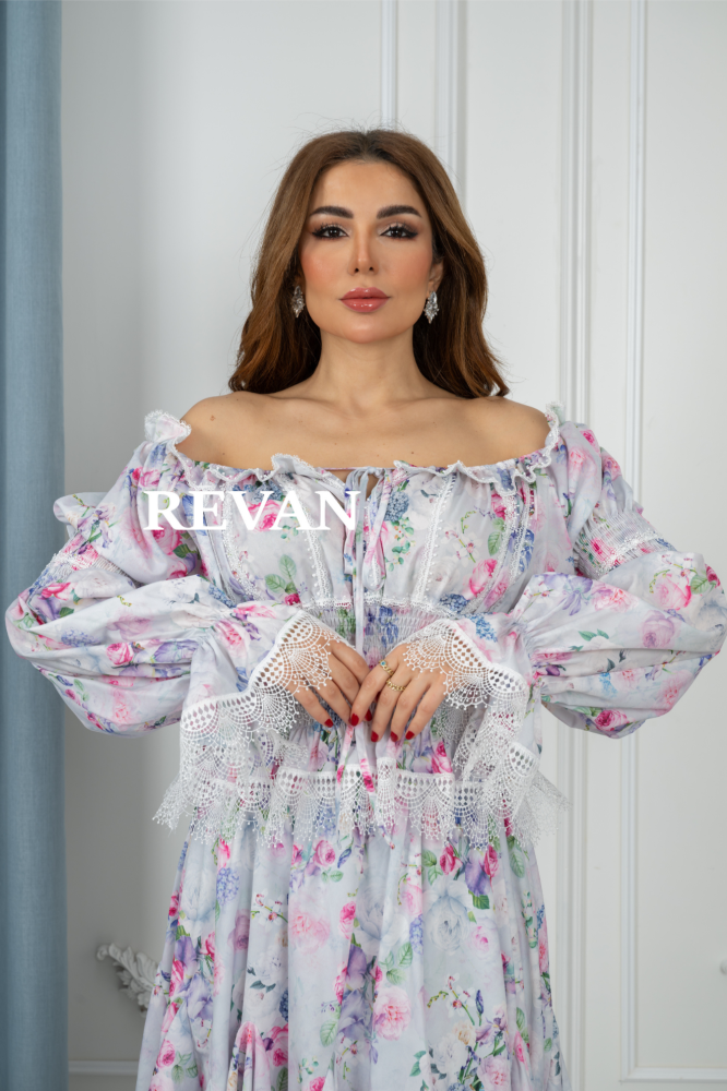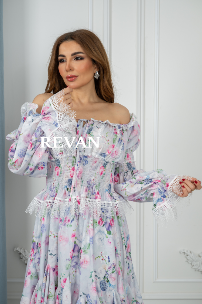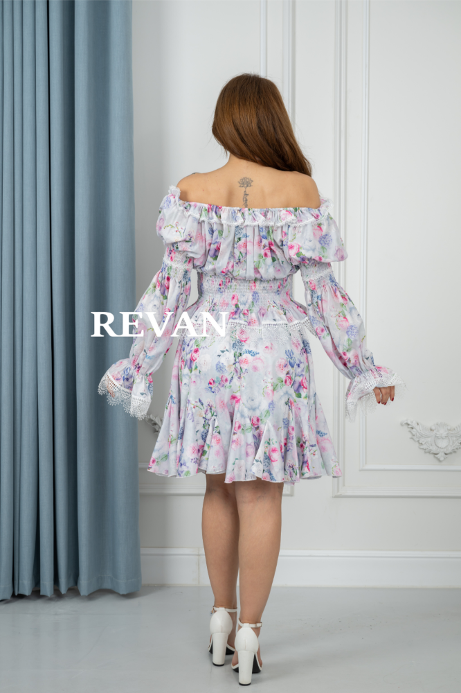 فستان قصير مفعم بالأنوثة، يتميز بقصة كلاسيكية مع أكمام طويلة ومزخرف بنقوش زهرية ناعمة تجمع بين ألوان الباستيل الرقيقة. تصميم مثالي للمناسبات النهارية والإطلالات الأنيقة.