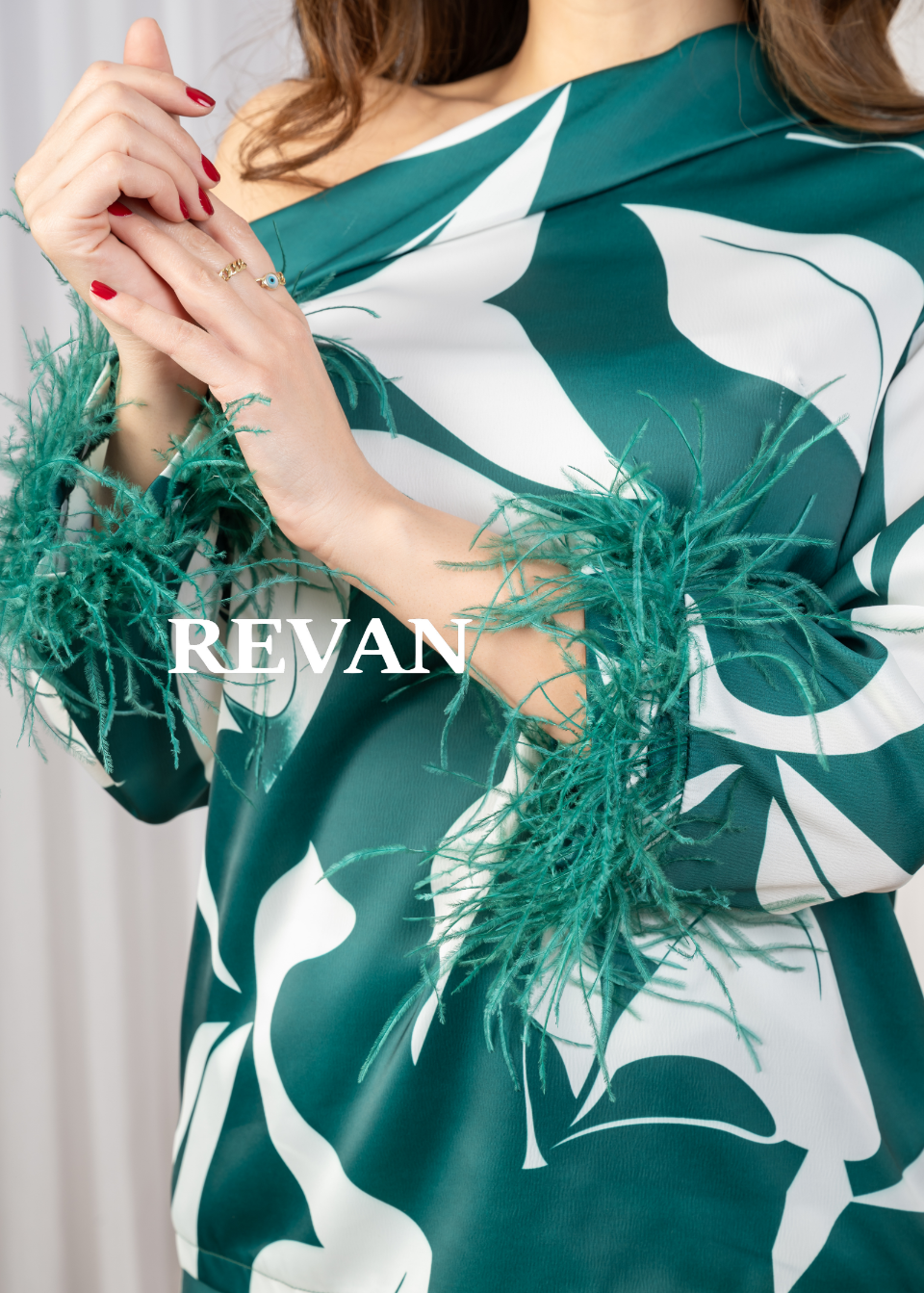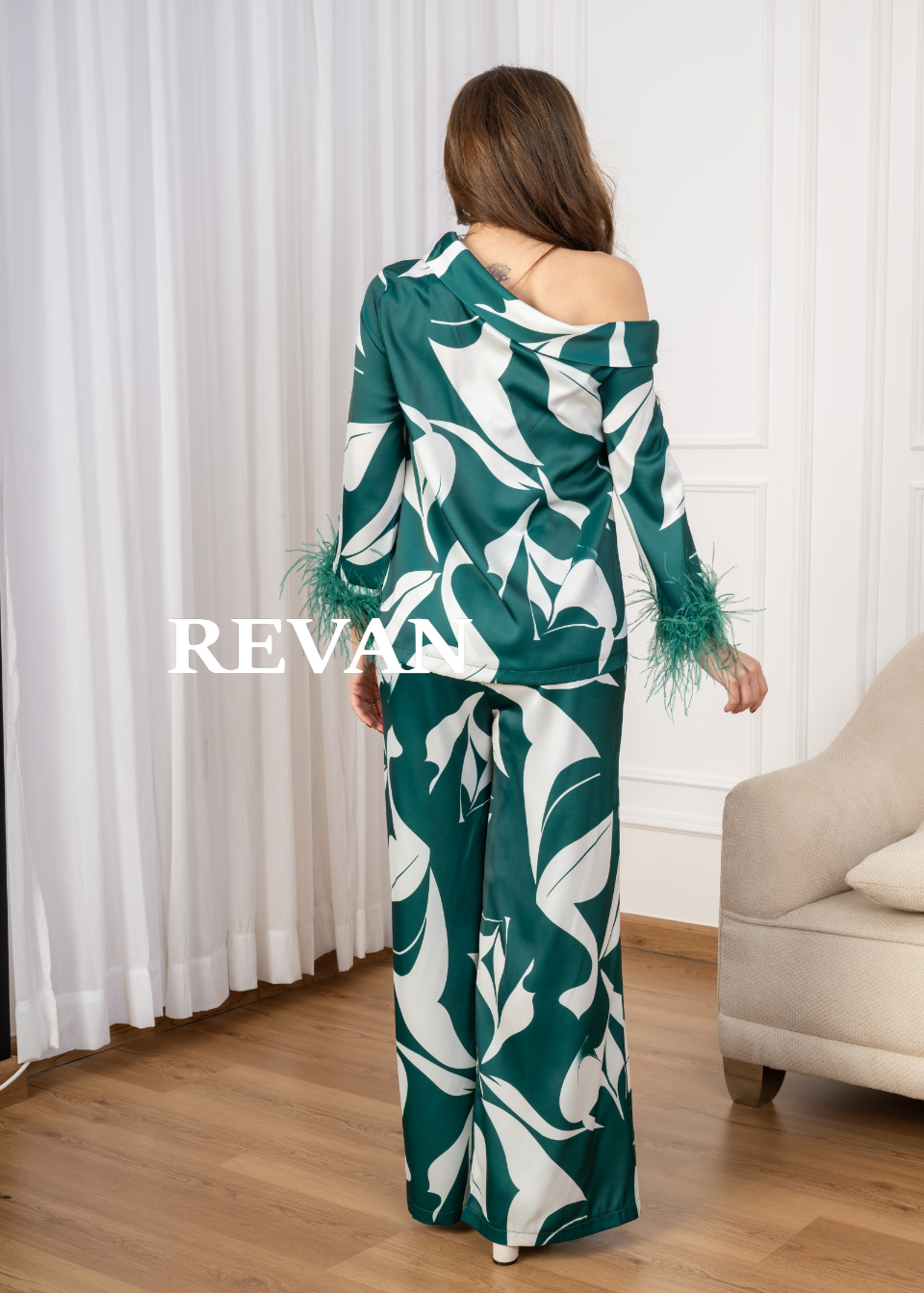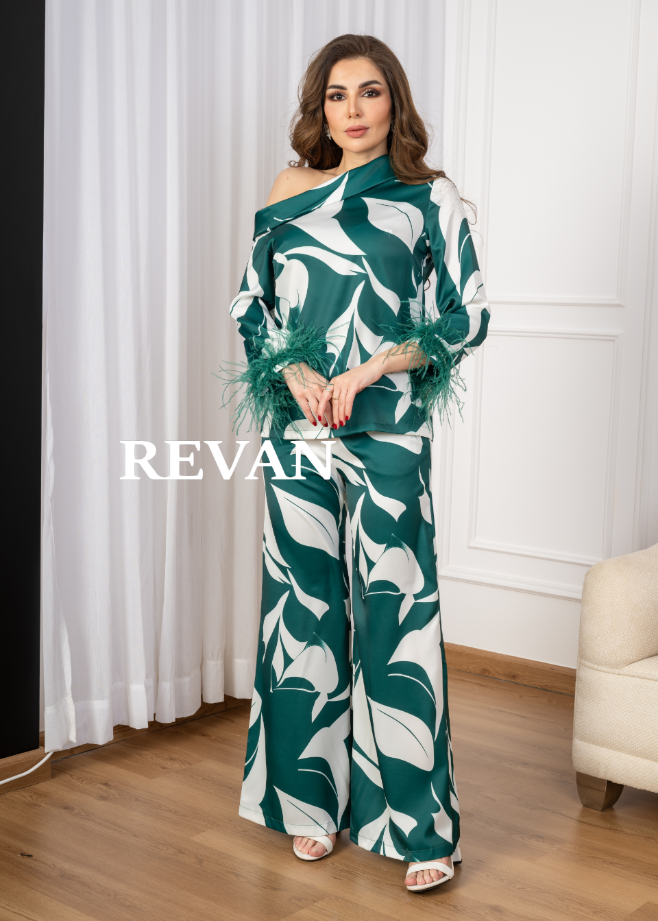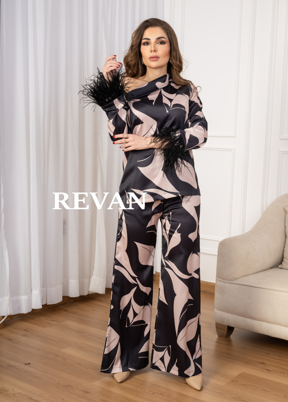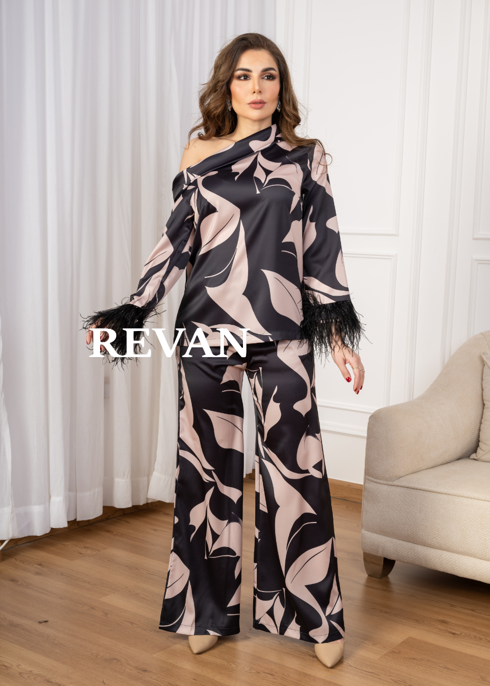 طقم أنيق يجمع بين الفخامة والعصرية بتصميم جذاب، يتميز بقصة مريحة ونقوش جذابة تضفي لمسة فريدة. الأكمام مزينة بالفرو لمظهر فاخر ومميز، مما يجعله خيارًا مثاليًا لإطلالة راقية تليق بجميع المناسبات