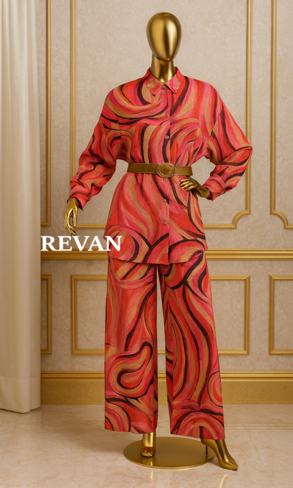 - التصميم: طقم مكون من قميص بأزرار وبنطلون واسع