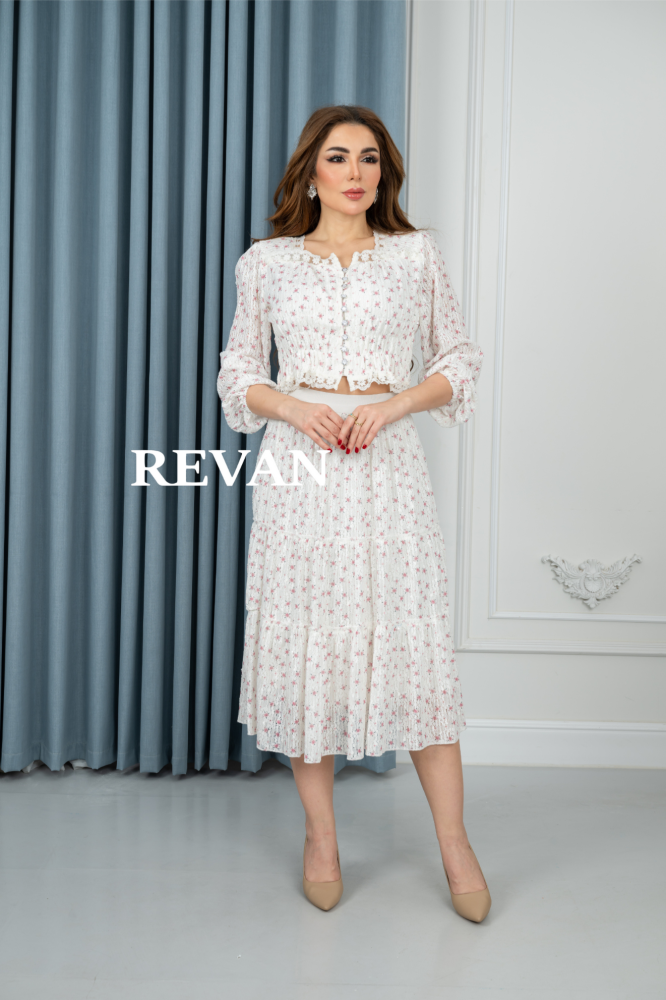 طقم أنثوي مكون من بلوزة قصيرة بأكمام طويلة وتنورة متوسطة الطول، مزين بنقوش زهرية رقيقة تضيف لمسة من الأناقة والجمال. مصمم بألوان فاتحة ناعمة تناسب الإطلالات الصيفية والمناسبات النهارية. مثالي لإطلالة أنيقة ومريحة في نفس الوقت.