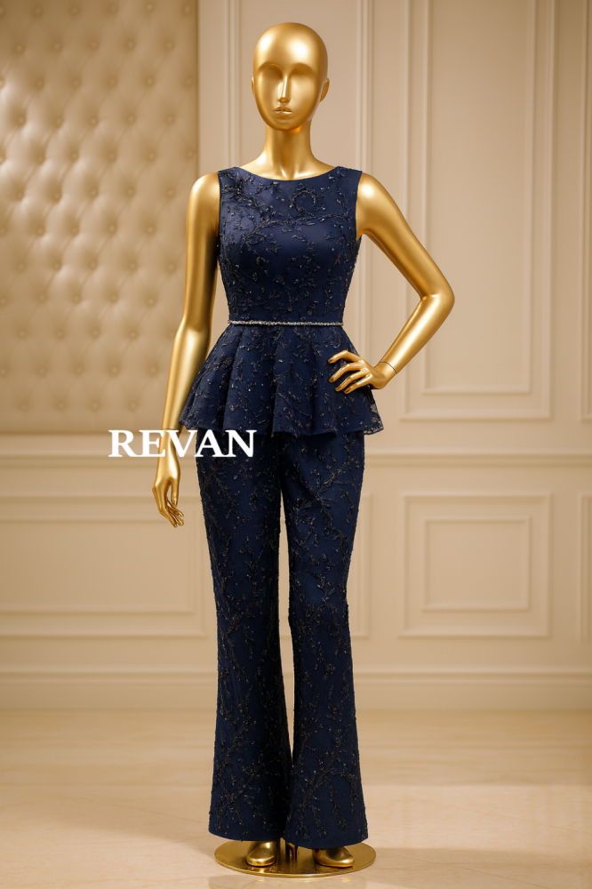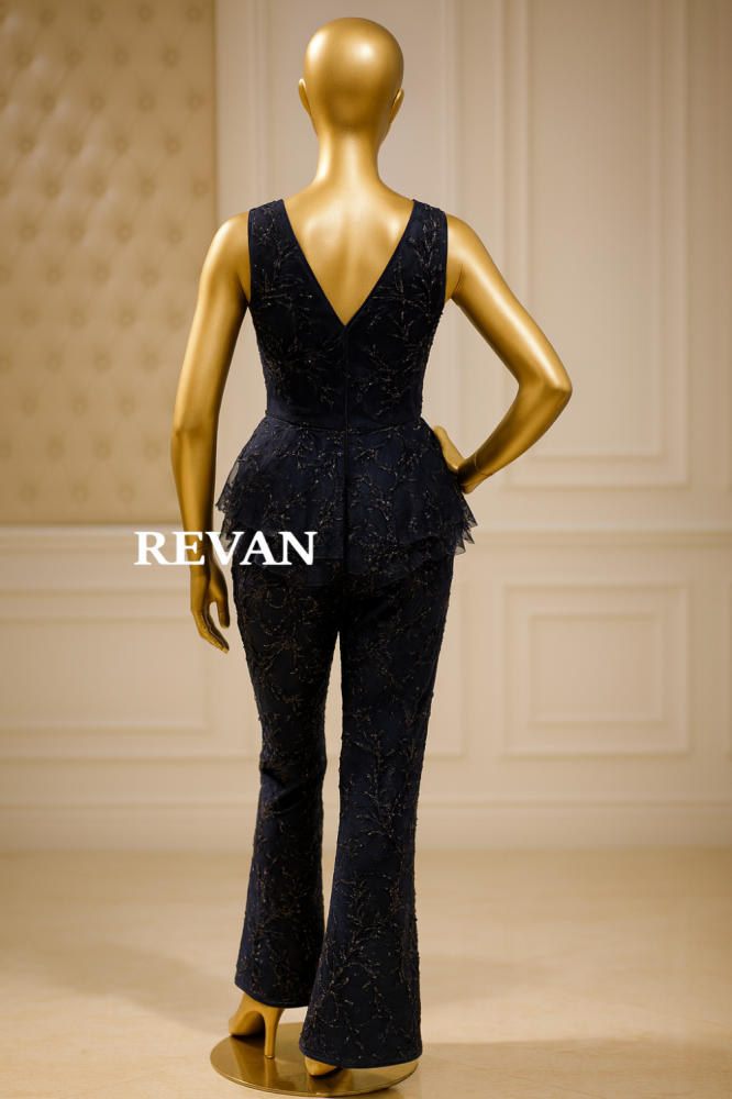 طقم كحلي مطرز مكون من بلوزة مع بنطال أنيق من ريڤــان