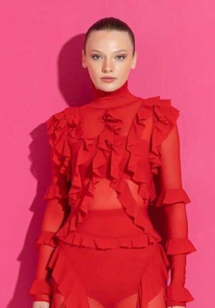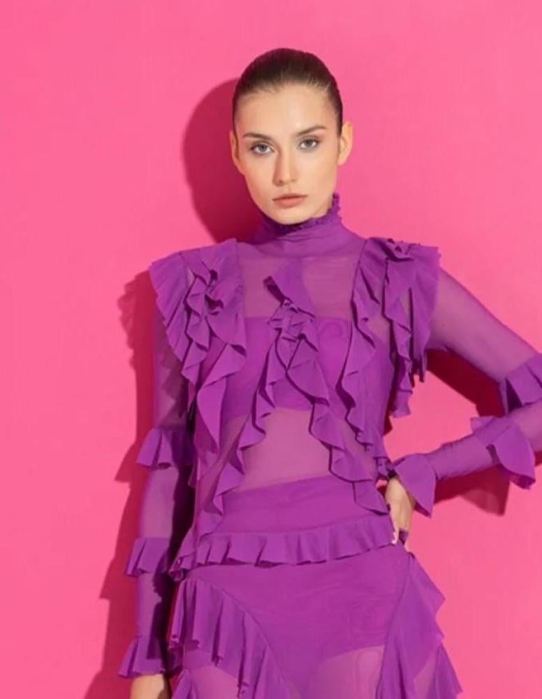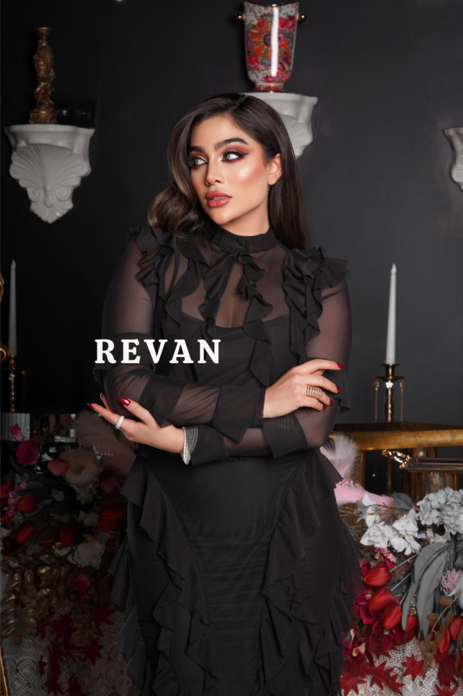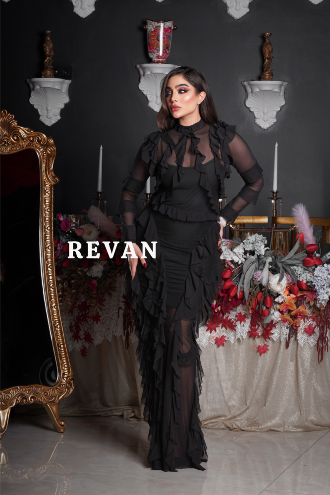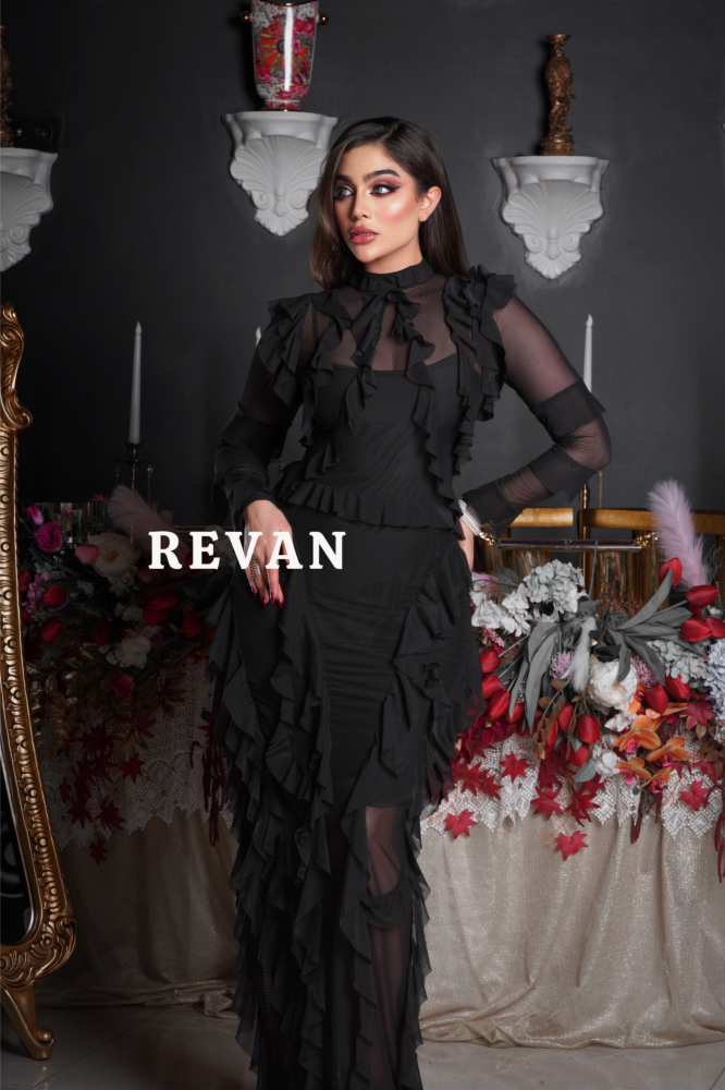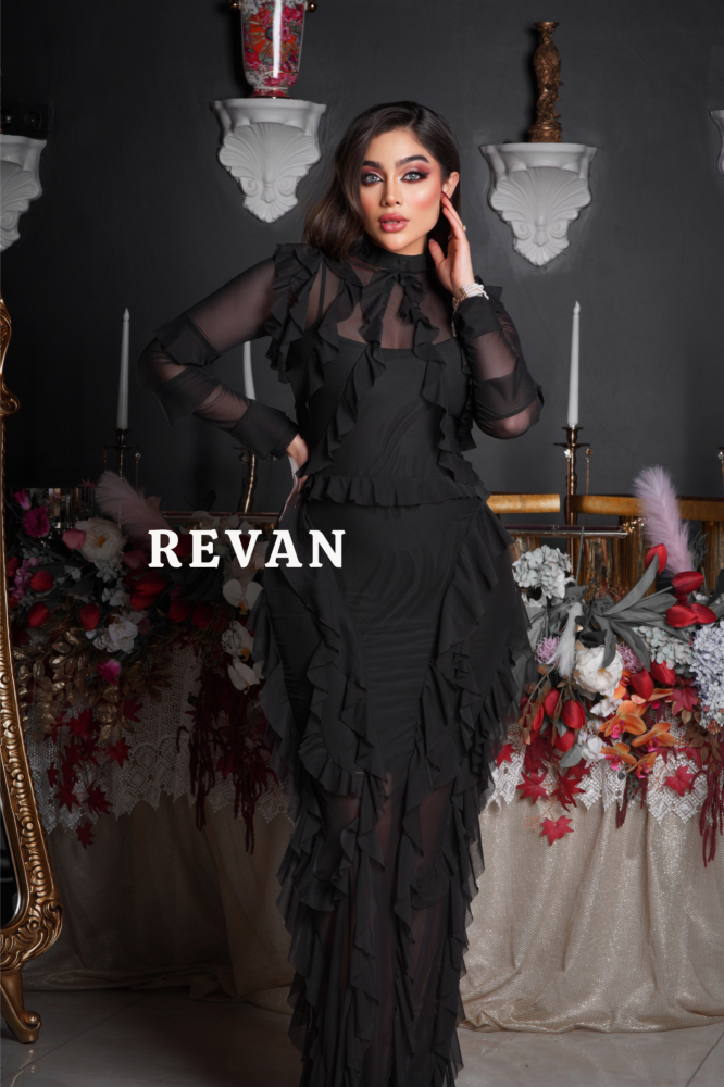 فستان طويل بتصميم كلاسيكي يجمع بين الأناقة والجاذبية. يتميز بقماش شفاف مع طبقات من الكشكش تضيف لمسة أنثوية مميزة. ياقة مغلقة بربطة ناعمة تزيد من فخامته، مع أكمام شفافة تضفي على الإطلالة رونقاً خاصاً. مناسب للسهرات والمناسبات الخاصة لمحبات الإطلالات الأنيقة والفخمة.