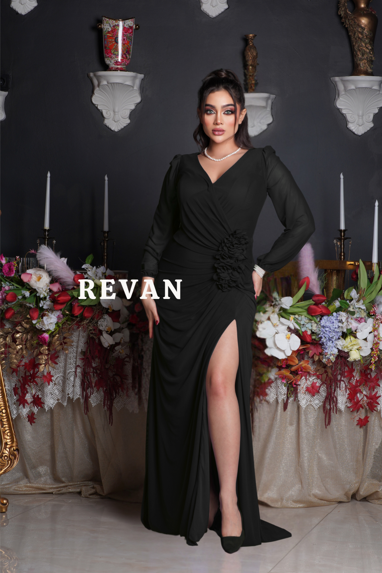 فستان بتصميم راقٍ ومميز مع تفاصيل الورود الجانبية وقصة جذابة تُبرز جمال الإطلالة. مثالي للسهرات والمناسبات لإطلالة استثنائية تليق بكِ.