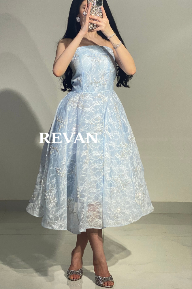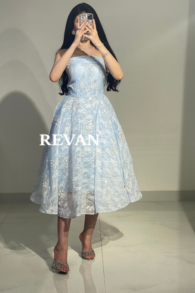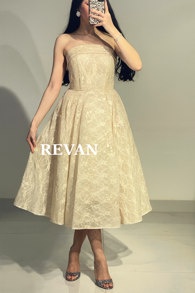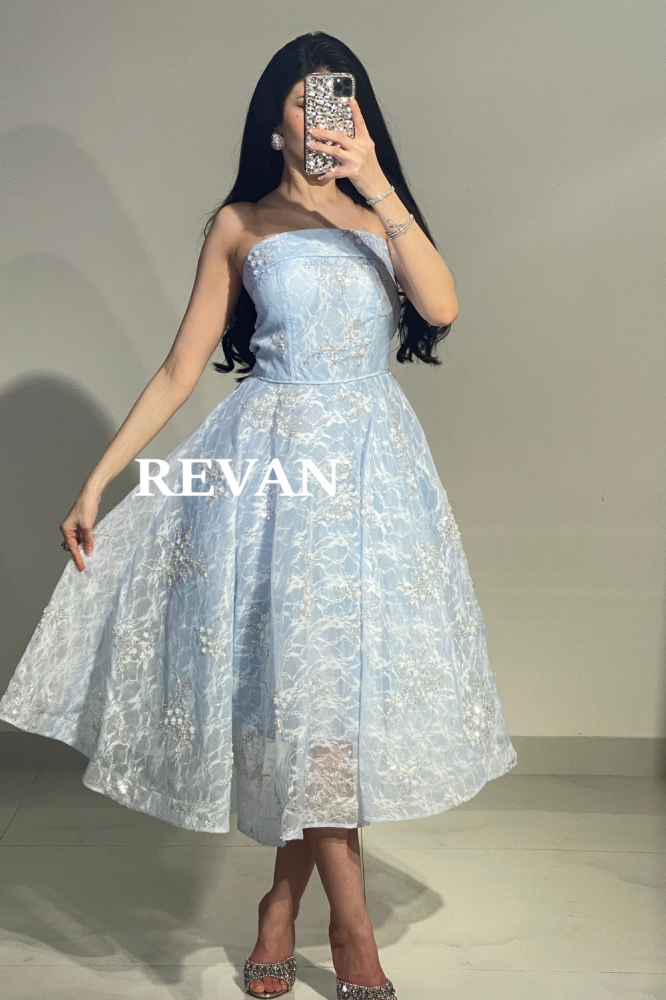 فستان يجمع بين الرومنسية والأنوثة؛ بلوزته المشدودة تحتضن الصدر برقة، بينما تنسدل الواسعة بطول متوسط لتمنحك إطلالة حالمة وأنيقة في كل حركة. دانتيله الفاخر يضيف لمسة فاخرة وتفاصيل دقيقة تعكس فخامة المناسبات السعودية.