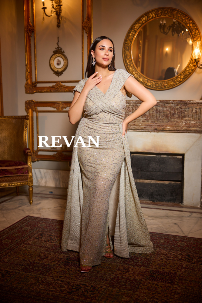 فستان سهرة يعكس بريق رمال الصحراء الذهبية بلمعان الترتر وتفاصيل الطيّات الأنيقة. الجناحين الجانبيين يمنحان الحُرية في الحركة وسحر العباءة التقليدية بتحديث عصري، بينما تنسدل التنورة بشكل يشبه ذيل السمكة ليبرز القوام برشاقة لا متناهية. خيارك الأمثل لإطلالة ساحرة في ليالي الخليج الراقية.