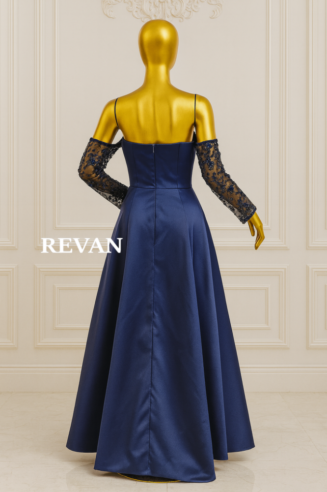 تصميمه الراقي يجمع بين البساطة المترفة والجرأة الناعمة، مع تنورة طويلة منسدلة تعكس حضورًا ملكيًا. الأكمام المنفصلة المصنوعة من الدانتيل الشفاف والمطرز يدويًا تضيف لمسة رومانسية رقيقة، فيما يمنحك القماش الانسيابي راحة وأناقة متكاملة. الخيار المثالي للسهرات والمناسبات المميزة.