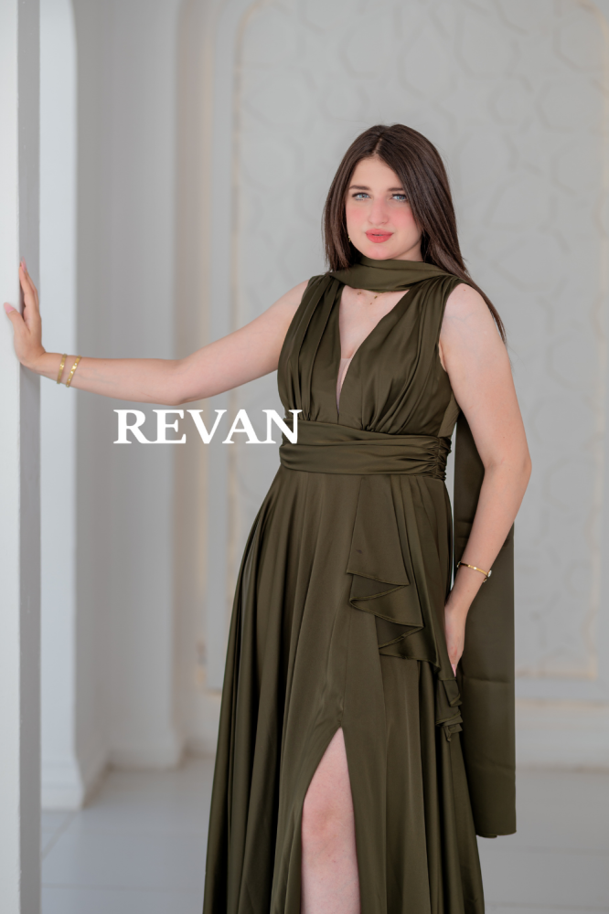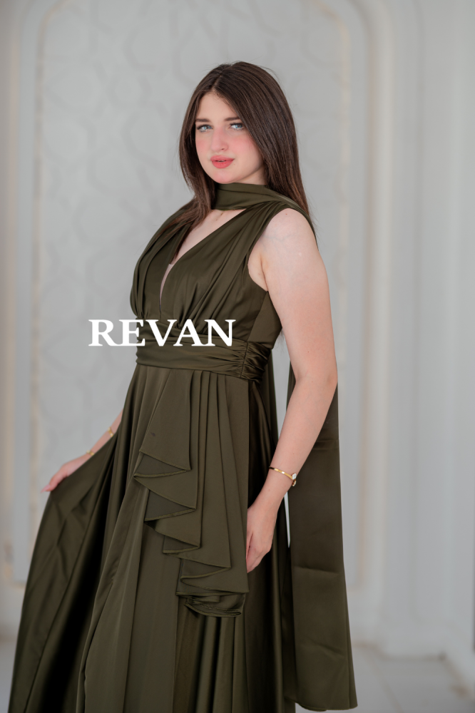 احصلي على حضور فخم ومميز مع هذا الفستان الانسيابي المصمم بتفاصيل أنيقة من الطيات الجانبية، مع ياقة طويلة منسدلة تمنحك لمسة ملكية جذابة. القصة الواسعة والفتحة الأمامية تضيفان لمسة أنثوية ساحرة لمناسباتك الخاصة.