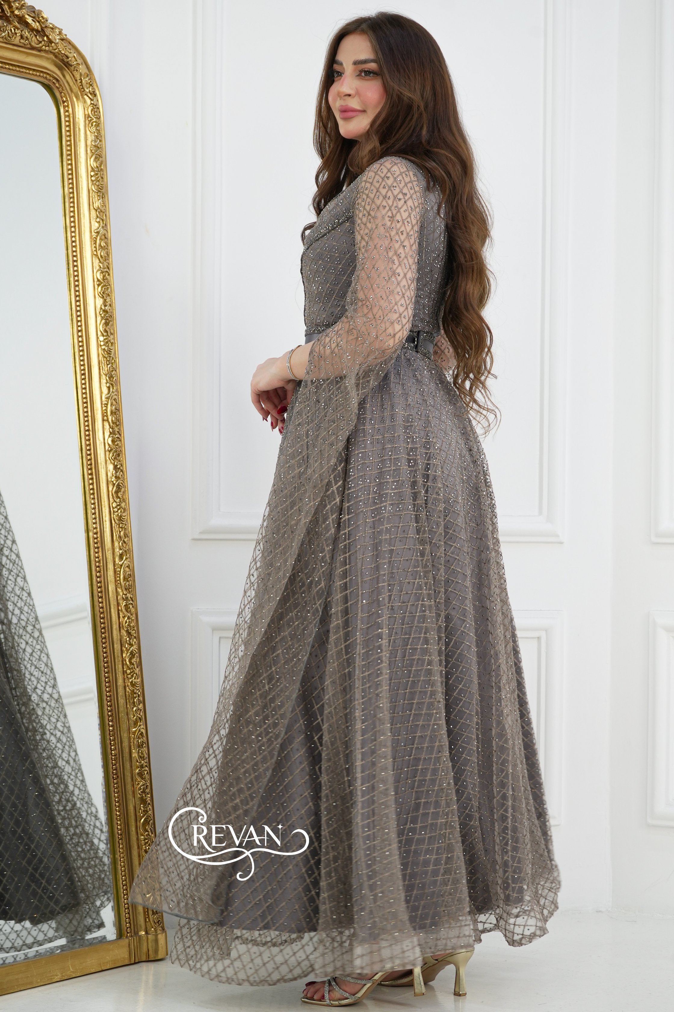 فستان سهرة فاخر باللون الرمادي اللامع يتميز بتصميم راقٍ وفخم.