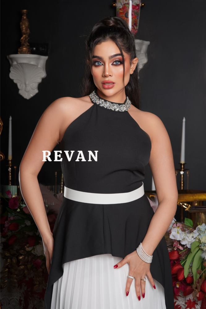 الجزء العلوي يأتي بتصميم ياقة مرتفعة مزينة بلمسات لامعة تضيف لمسة فاخرة،