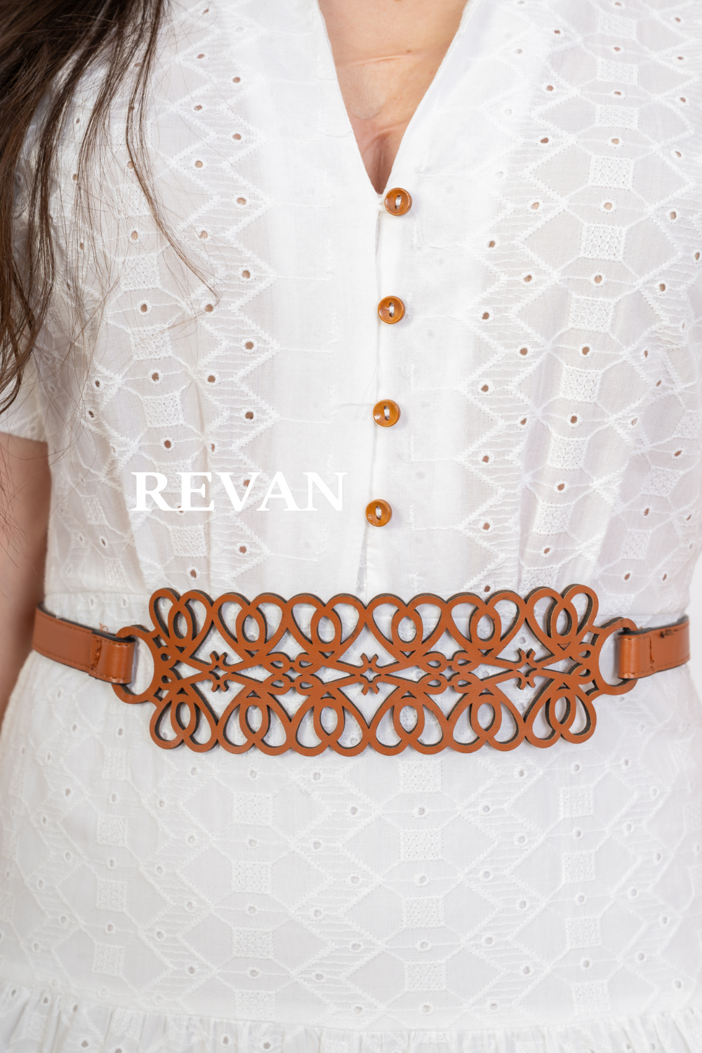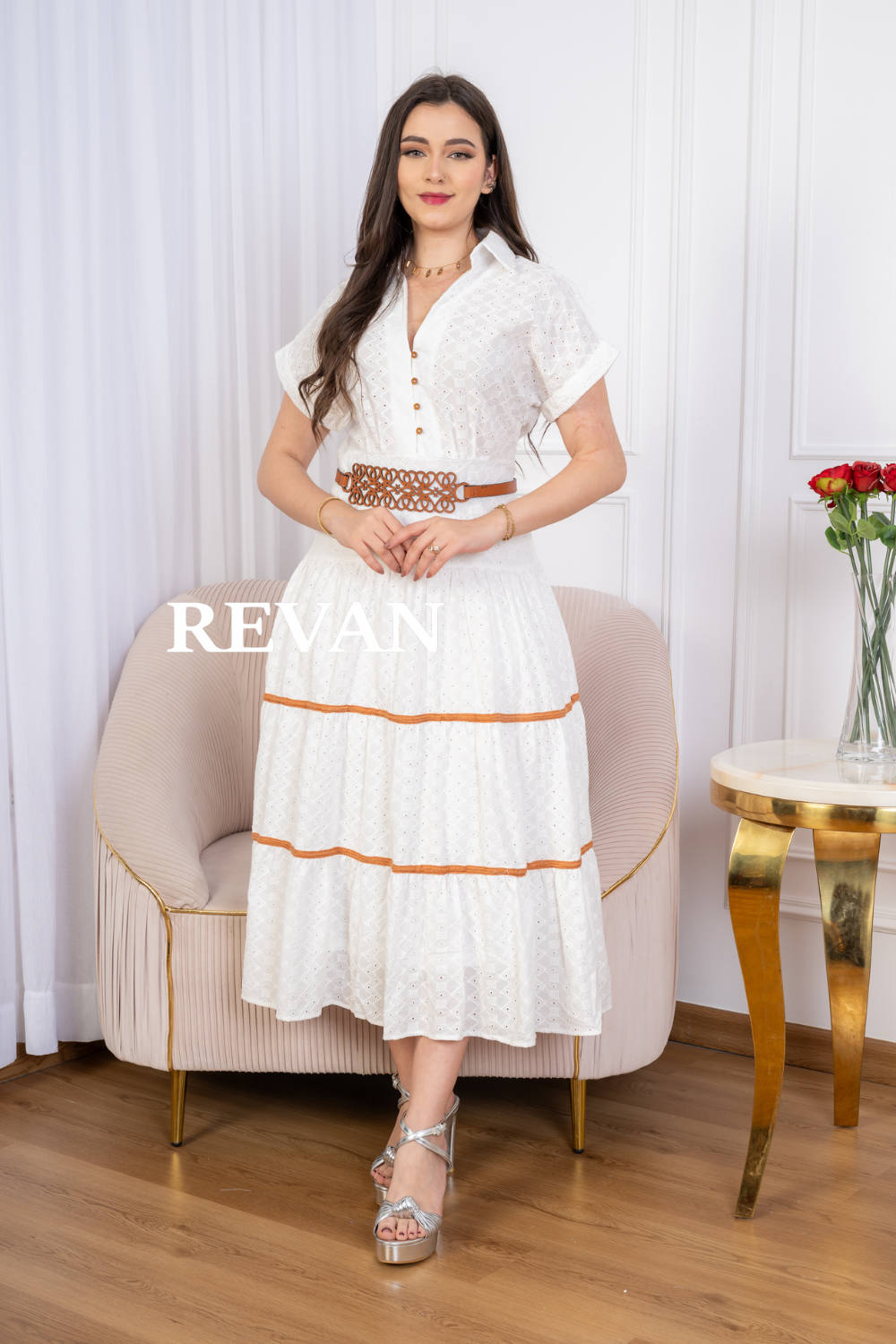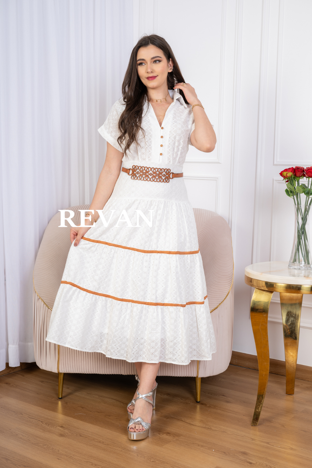 تميزي بإطلالة منعشة وأنيقة مع هذا الفستان الأبيض المميز، بتصميم مريح وعصري مزين بتفاصيل ناعمة تمنحك إحساساً بالرقي والأنوثة، مع لمسات باللون البني لإضفاء لمسة من التميز.