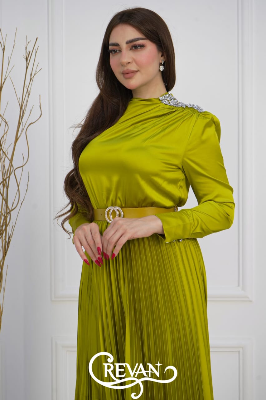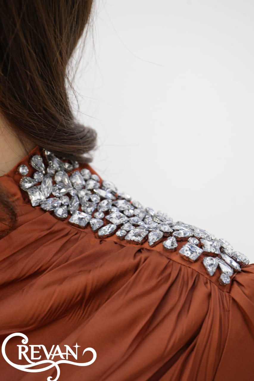 فستان ميدي ساتان مزين بكريستال على كتف واحد: