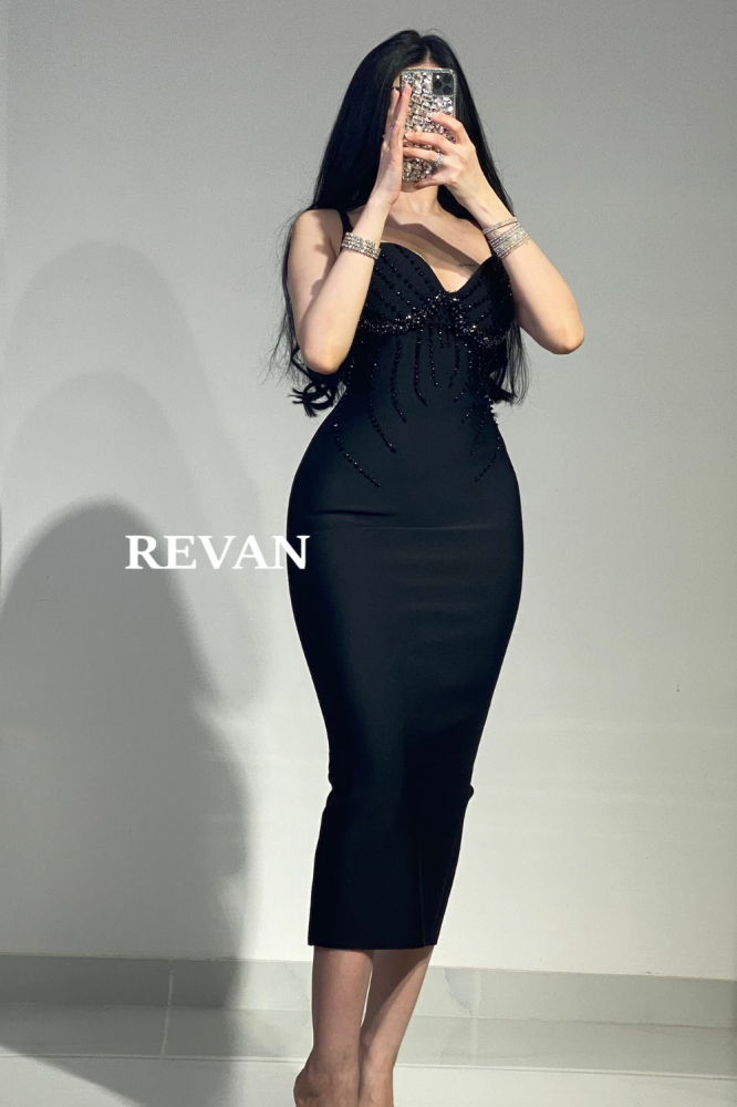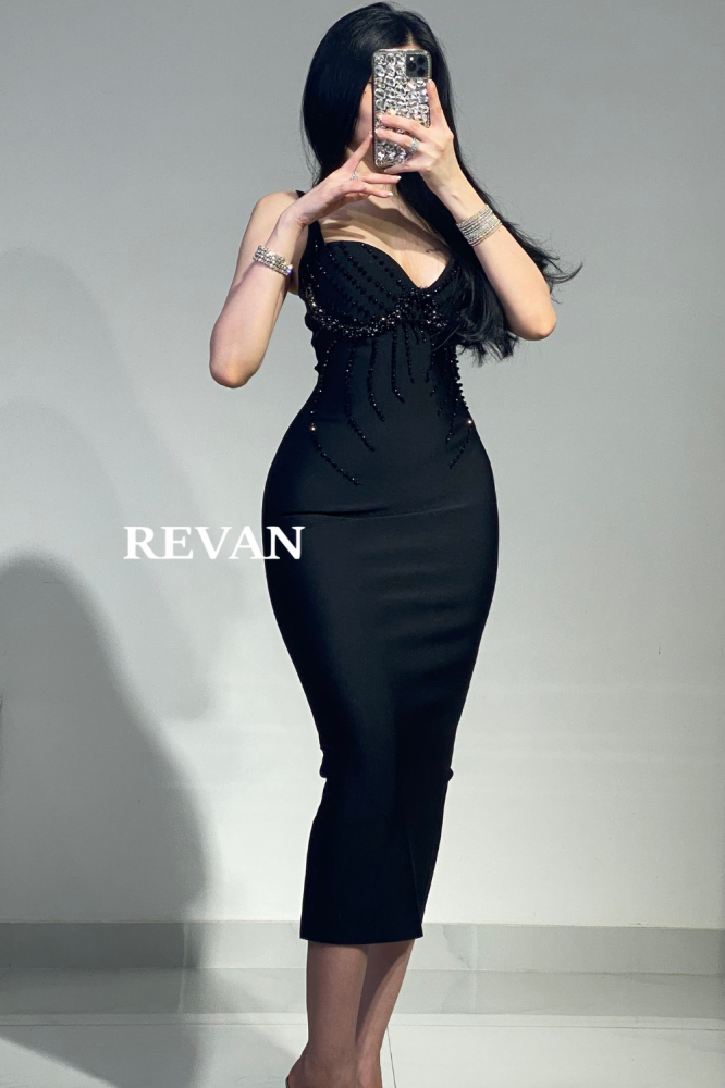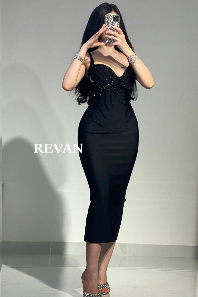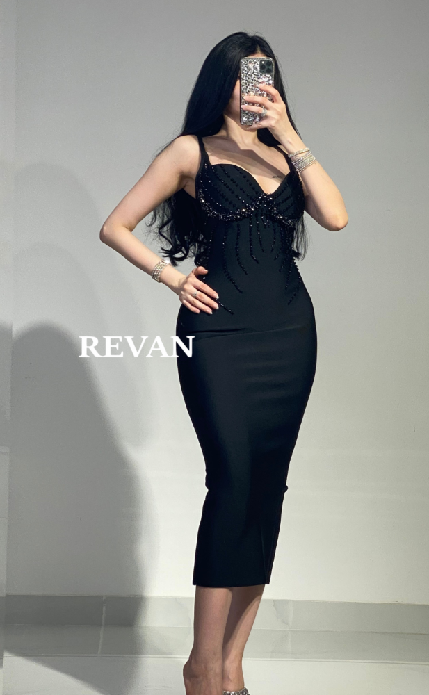 فستان ميدي فاخر من ريفان بتفاصيل جذابة تنبض بالأنوثة والرقي.