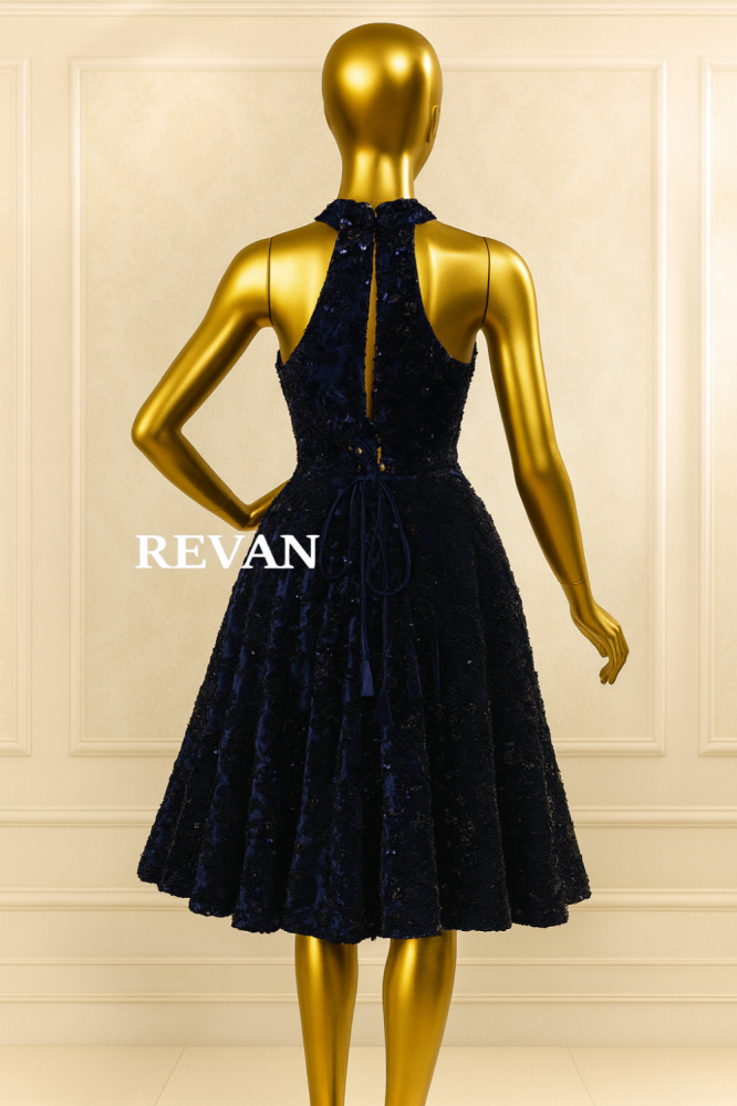 - خط العنق: رقبة عالية (Halter Neck) مع ظهر مفتوح جزئيًا