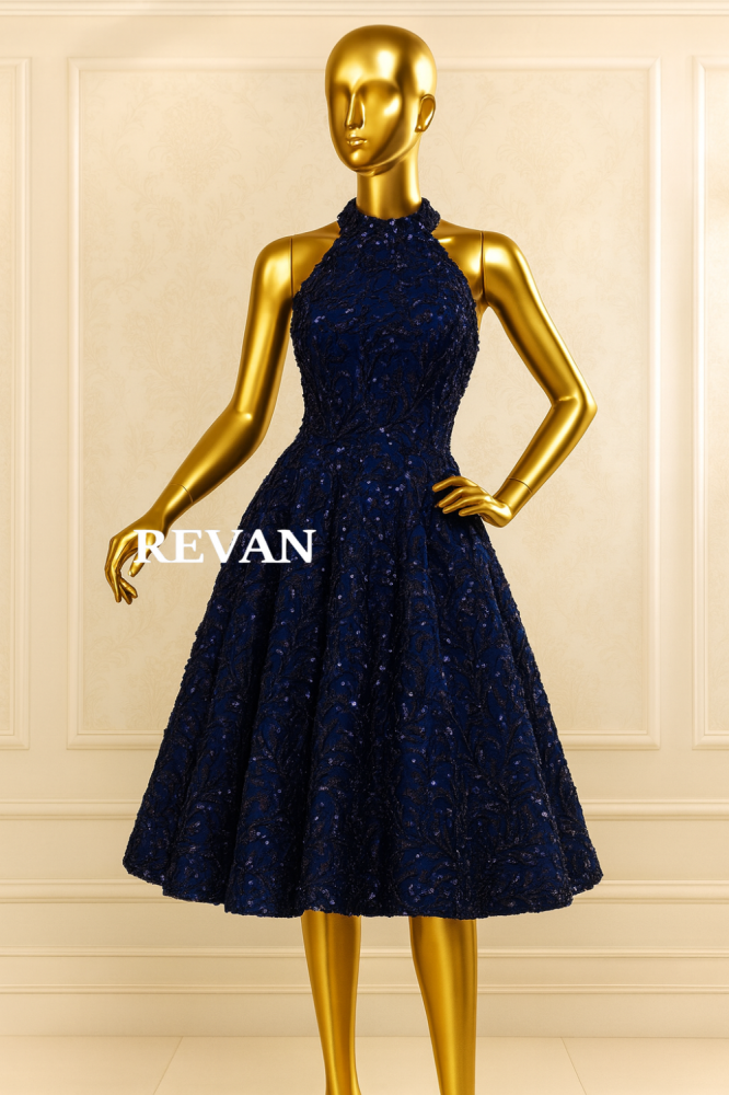 فستان ميدي أنيق باللون الكحلي الغامق، يتميز بتطريز فاخر بترتر لامع يغطي القماش بالكامل ليمنح إطلالة راقية تلفت الأنظار.
