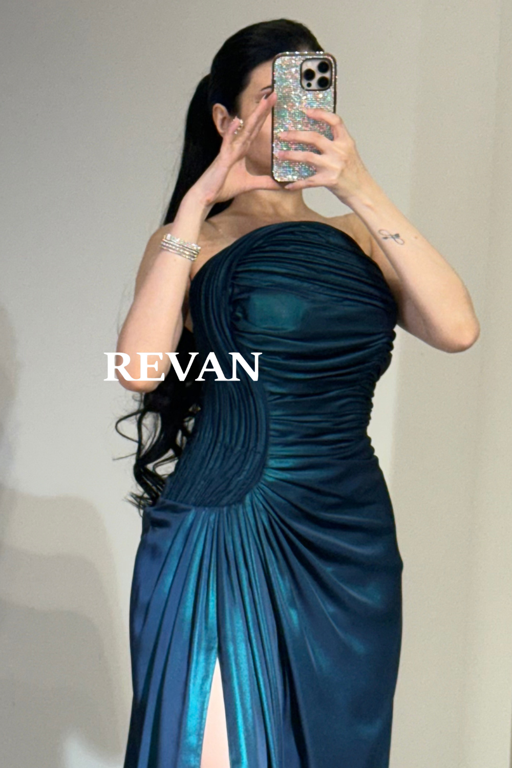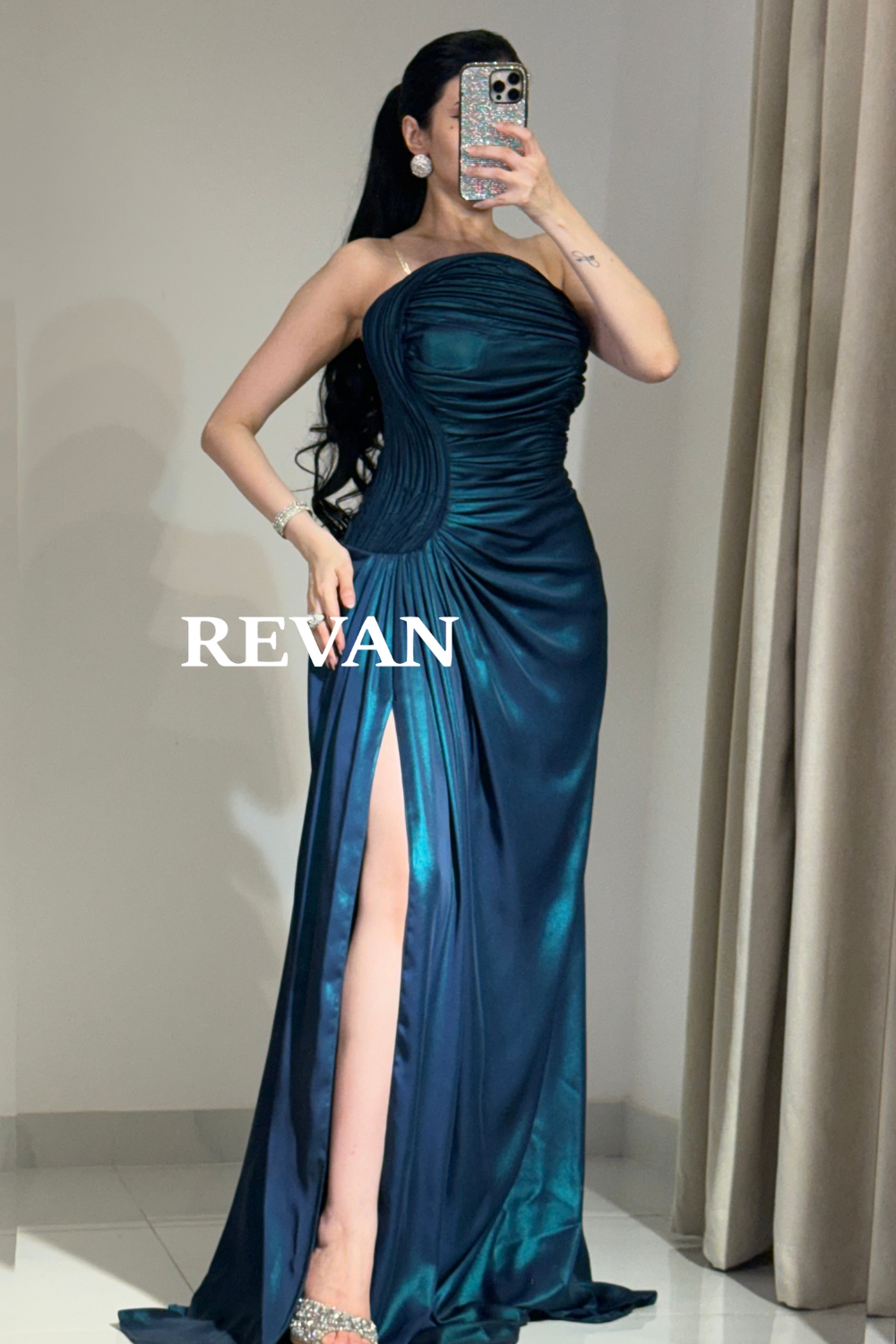 فستان سهرة فاخر من ريڤــان بقصة مكشكشة انسيابية مع شق جانبي أنيق يناسب أرقى المناسبات.