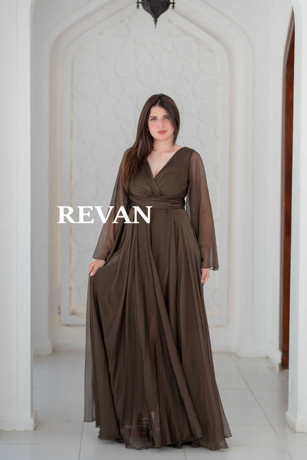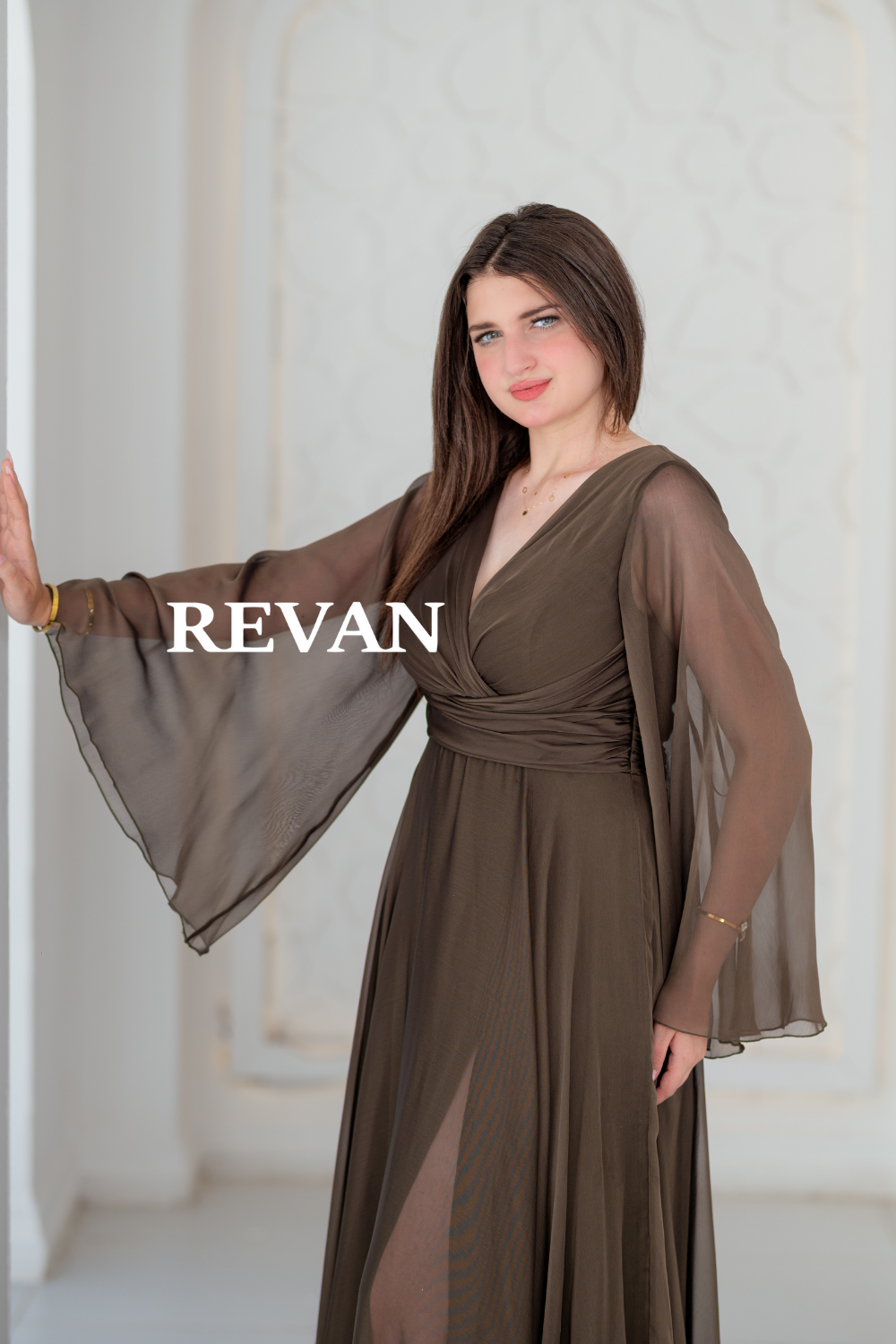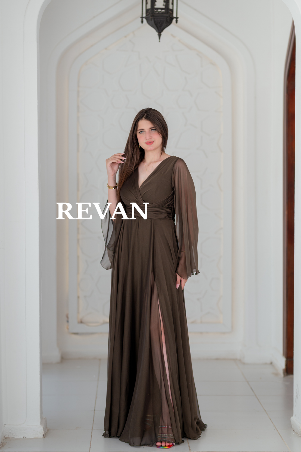 استمتعي بإطلالة ناعمة وأنيقة مع هذا الفستان المصمم من قماش الشيفون الخفيف. يتميز بأكمام طويلة شفافة وقصة ملفوفة تبرز الخصر مع فتحة جانبية تضيف لمسة من الجاذبية.