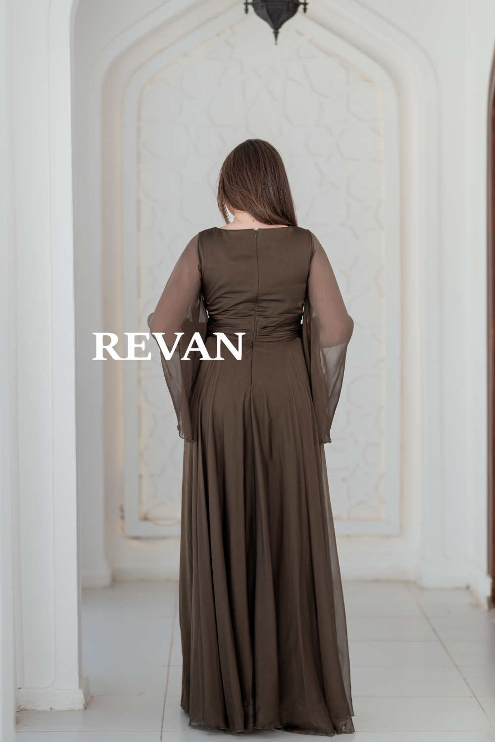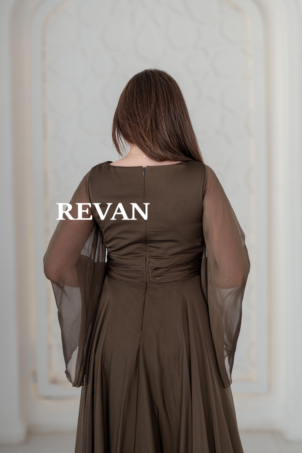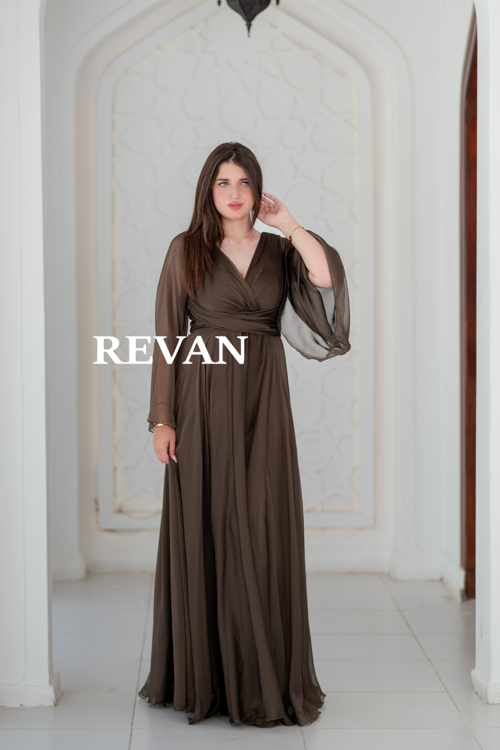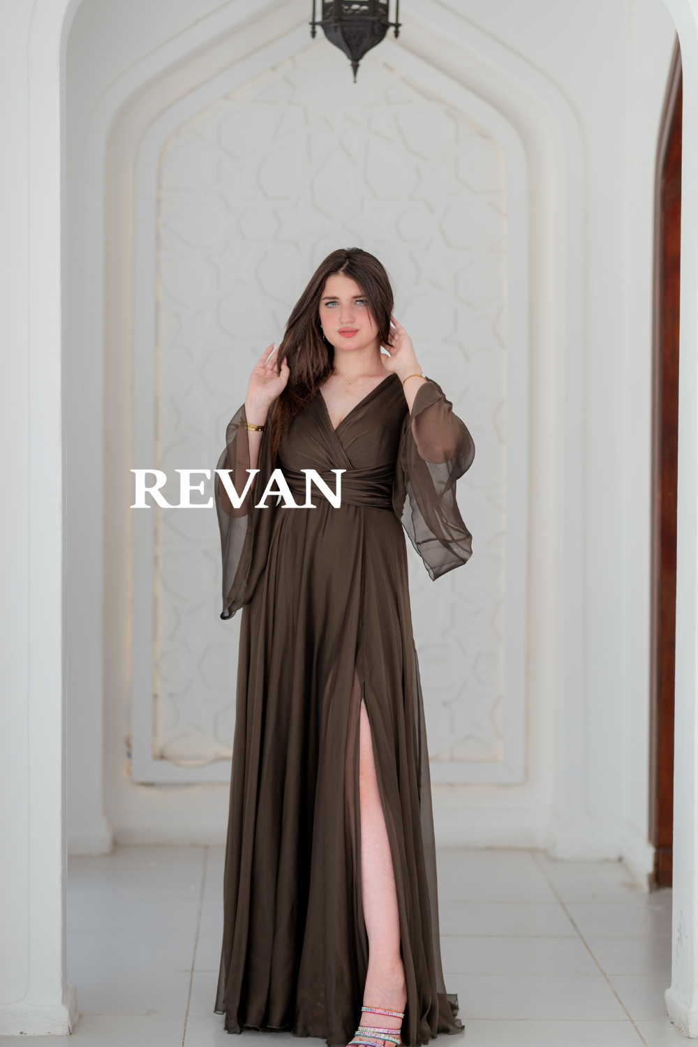 استمتعي بإطلالة ناعمة وأنيقة مع هذا الفستان المصمم من قماش الشيفون الخفيف. يتميز بأكمام طويلة شفافة وقصة ملفوفة تبرز الخصر مع فتحة جانبية تضيف لمسة من الجاذبية.