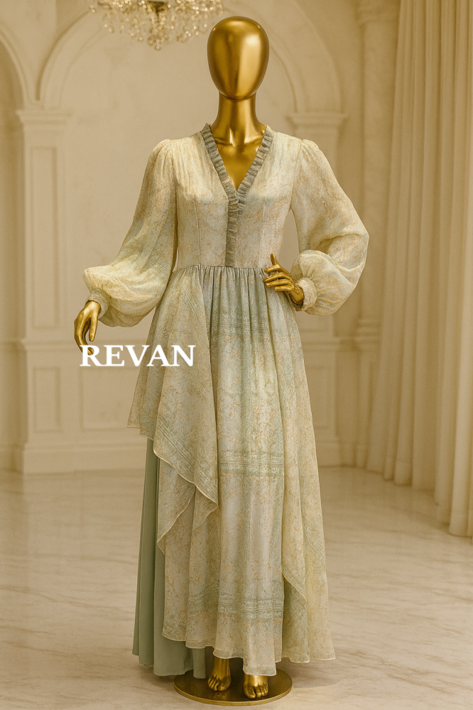 بأكمام منفوخة مصنوع من نسيج خفيف الوزن سهل الحركة مزين بنقوشات رقيقة يعكس جمال هذا التصميم