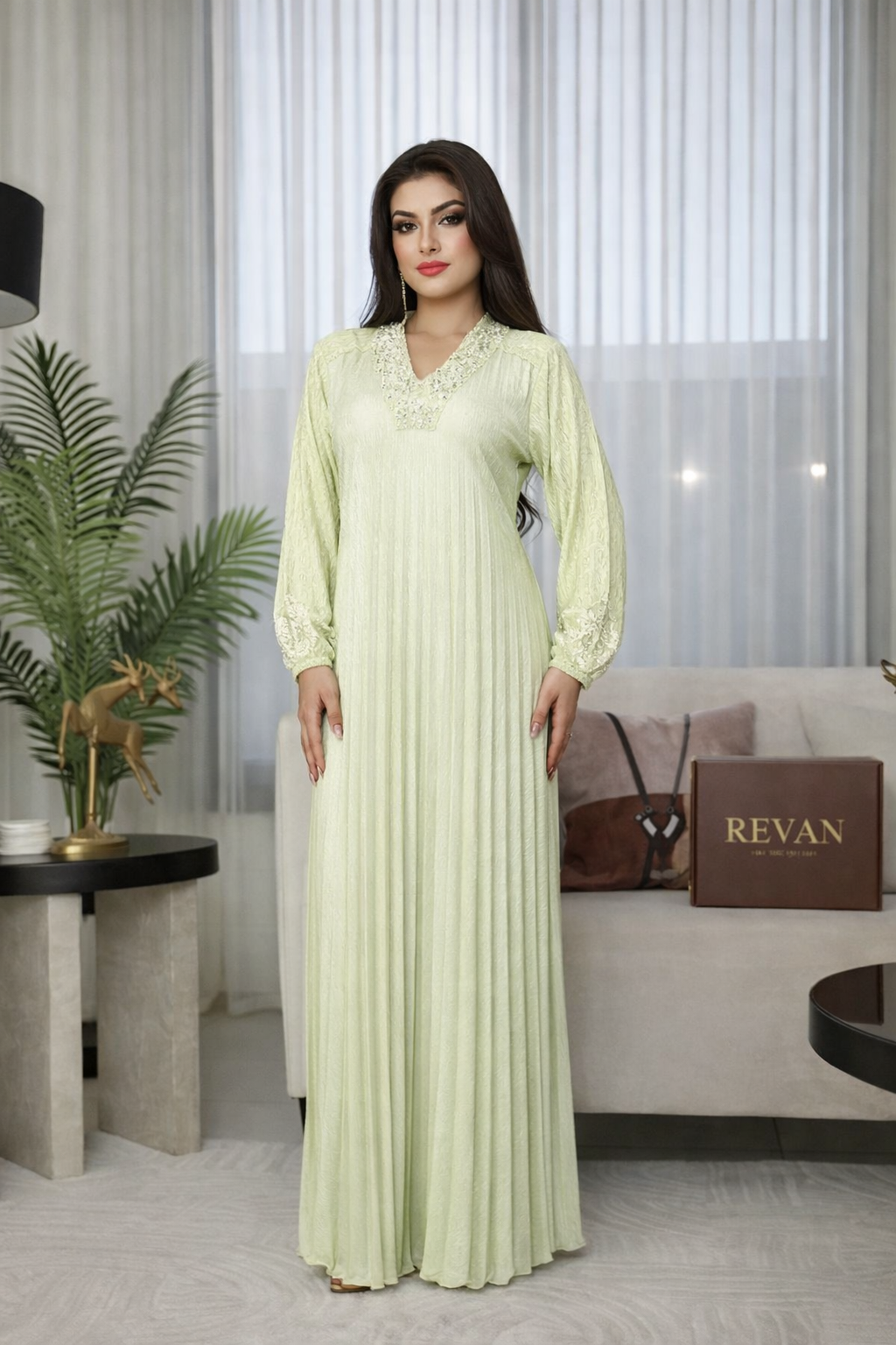 The long, flowing sleeves add a touch of quiet femininity, while the overall design stands out with a modest and elegant look, perfect for Iftar and Suhoor gatherings and upscale Ramadan visits.