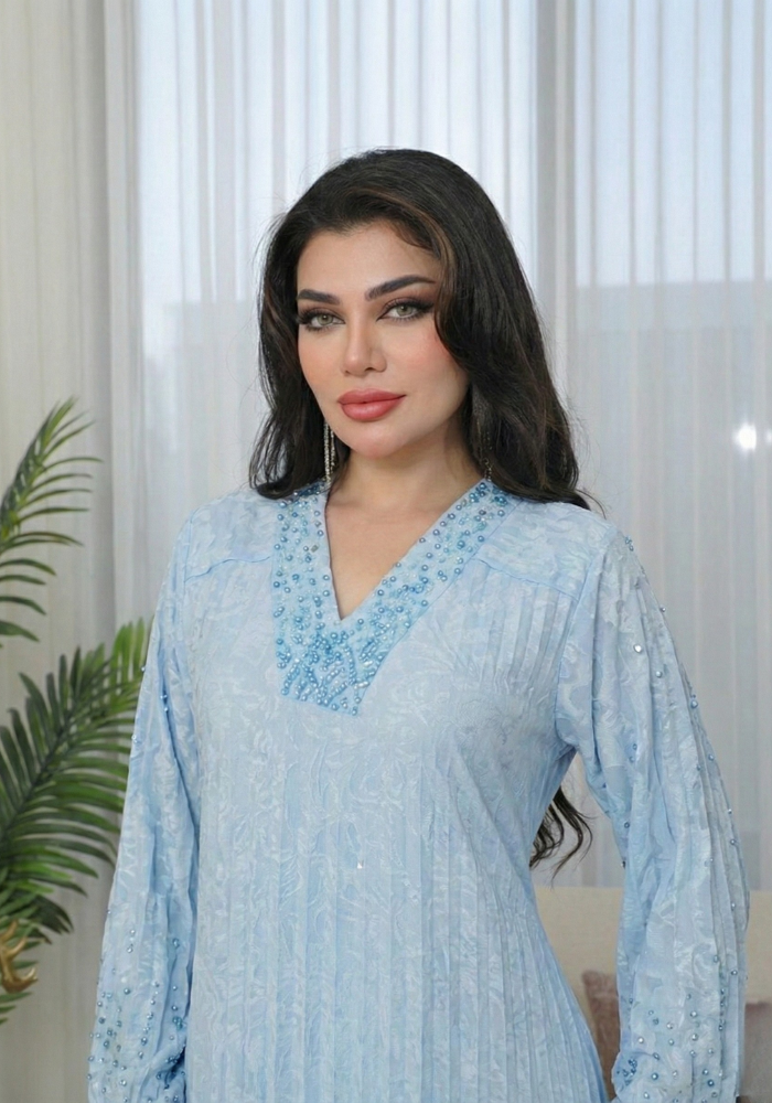 In the serene and peaceful atmosphere of Ramadan, this jalabiya comes with an elegant feminine design that combines simplicity and luxury, to give you a balanced look that suits the nights of the holy month.